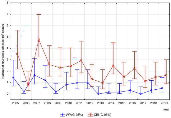 - Grabarczyk, P.; Seyfried, H.; Brojer, E.; Rosińska, M.; Mikulska, M.; Łętowska, M. Wykrywanie HBsAg u polskich dawców krwi w latach 1995–2004. J. Transf. Med. 2009, 1, 20–25. [Google Scholar]