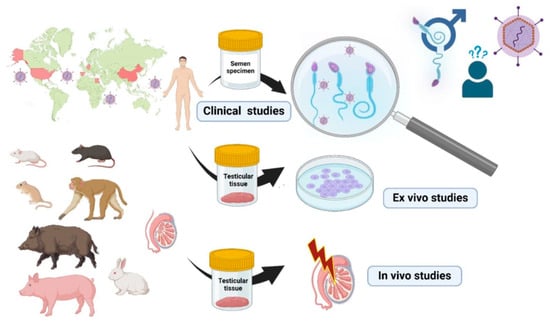 In this review, we will discuss the effect of HEV infections on the male reproductive system and the excretion of HEV in the semen samples, which raise concerns about the possibility of HEV transmission via sexual intercourse. We collected articles that assessed HEV in patients’ samples and in vivo and in vitro model systems used to evaluate the possibility of HEV infection in the male reproductive system as well as the infectivity of HEV particles excreted in these organs or fluids (summarized in Figure 1).