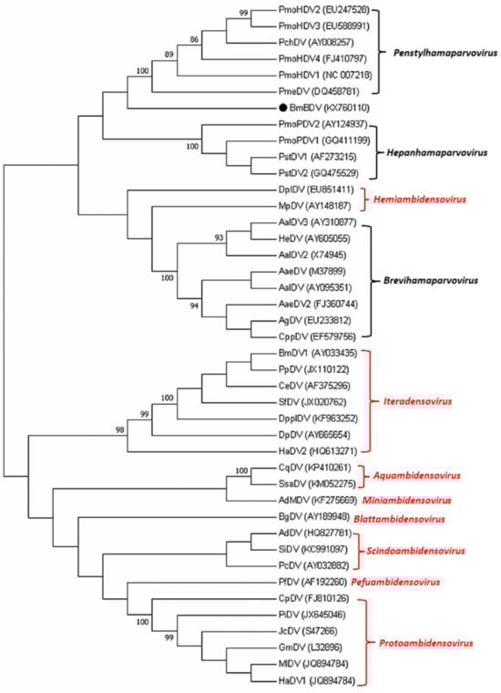 Phylogenetic analysis of invertebrate ssDNA viruses’ NS2. Note: for the evolutionary analysis using MEGA7, we inferred the evolutionary history using adjacency. The optimal tree with a total branch length of 17.05648256 is shown. The percentage of repeat trees where the relevant taxa clustered together in the guided test (2000 replicates) is shown next to the branch. The evolutionary distance was calculated using the Poisson correction method, measured as the number of amino acid substitutions at each site. The analysis contained 42 amino acid sequences. We removed all locations containing blank and missing data. There are a total of 113 locations in the final dataset. At the side of the evolutionary tree, the genus of the virus is marked: red indicates the genus of viruses within the subfamily Densovirinae, and black indicates the genus of viruses within the subfamily Hamaparvovirinae.