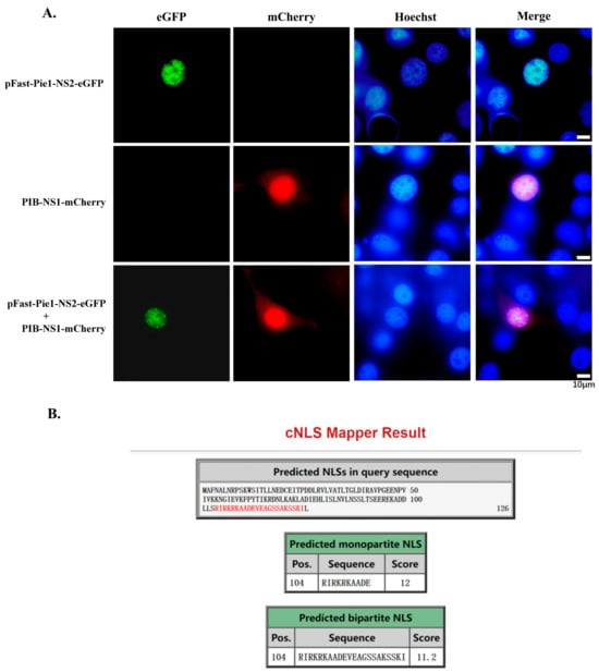 Subcellular localization of BmBDV NS2 and prediction result for NLS. (A) Subcellular localization of NS1-mCherry and NS2-eGFP. (Bar: 10 μm). (B) Prediction results of BmBDV NS2 NLS from NLS mapper website.