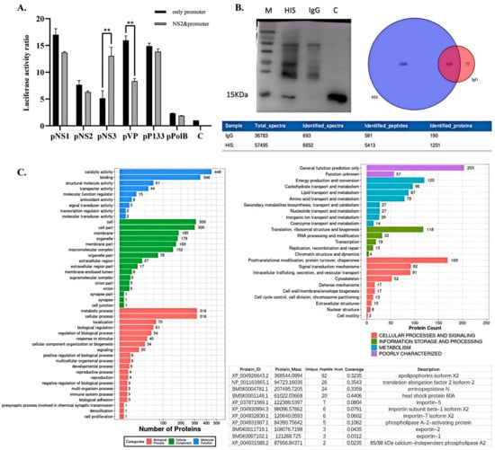 Analysis of the effect of the NS2 protein on the activity of various viral protein promoters of BmBDV and the potential interacting host proteins of NS2. (A) The luciferase reporter plasmids contain different viral proteins’ promoter elements. An NS2 overexpression plasmid was constructed by replacing luciferase ORF with NS2 ORF controlled by a P10 promoter. BmN cells were transfected with the promoters individually or co-transfected with the NS2 overexpression plasmid. The luciferase activity was observed. The black boxes show the original promoter activity, and the gray boxes show promoter activities after co-transfection with NS2. (n = 3). Error bars denote standard deviation. **, p < 0.05. (B) Western blot detection of the NS2 Co-IP results and NS2 expression in the Bombyx mori midgut. The mass spectrometry peptide identification results were compared between IgG and His samples. A Wayne diagram showed the number of different proteins. (C) GO and KOG analysis of specific proteins in HIS experimental group.