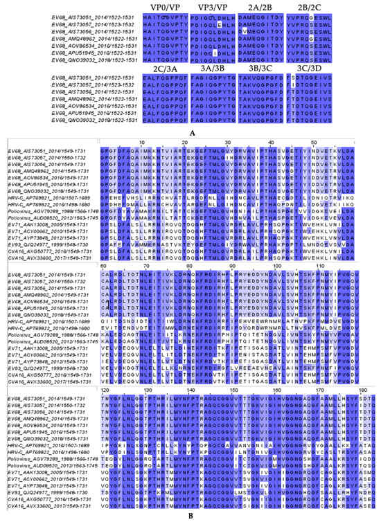 The conservation of amino acid sequences for 3C protease and viral polyprotein cleavage sites: (A) cleavage site sequences in EV68 strains and (B) 3C protease sequences across picornaviruses, highlighting the conserved regions with darker shades.