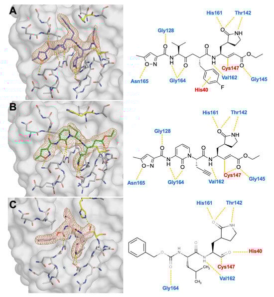 Co-crystal structures of EV68-3C protease with inhibitors: (A) irreversible covalent inhibitors rupintrivir (slate blue) and (B) AG7404 (green) and (C) reversible covalent inhibitor GC-376 (pink). On the left panels, the protease is depicted as a gray surface while the inhibitor is represented as a colored stick within the electron density (2F0-FC map) and hydrogen bond interactions (yellow dashed lines) shown with the surrounding protease residues (gray sticks). The catalytic dyad residues (H40 and C147) are highlighted in yellow. The chemical structures of the bound inhibitors and hydrogen bonds with the EV68-3C protease residues are displayed on the right.