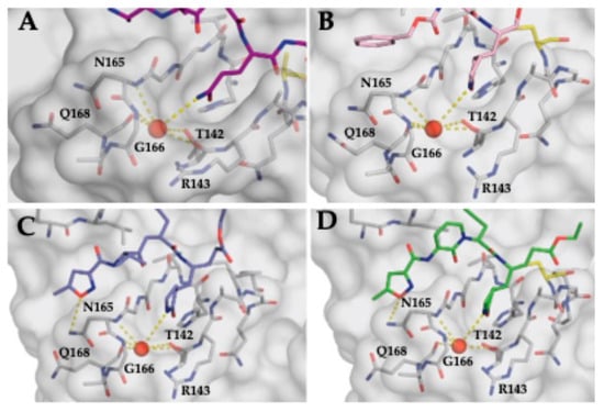 Coordination of an ordered water molecule within the S1 pocket of EV68-3C protease in ligand-bound crystal structures: (A) 3B3C peptide (purple sticks) PDB IDs: 9AX9 and (B–D) inhibitors (GC-376 in pink, rupintrivir in slate blue, and AG7404 in green, respectively) bound within EV68-3C protease. The hydrogen bonds between the water (red sphere) and surrounding EV68-3C protease residues (Thr142, Asn165, and Gly166) are depicted as dashed lines.