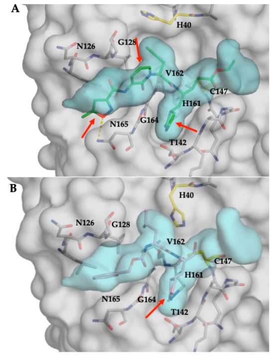 Fit of inhibitors within the EV68-3C protease substrate envelope: inhibitors (A) AG7404 (green sticks) and (B) GC-376 (pink sticks). The protease is shown as a gray surface with residues around the inhibitor represented as sticks (gray) and labeled. The inhibitor from the co-crystal structures has been superimposed onto the substrate envelope (cyan volume). Red arrows highlight regions of the inhibitor protruding from the substrate envelope.