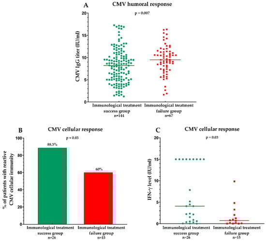 The proportion of subjects with reactive CMV-specific cellular immunity was significantly higher among patients with a good immunologic response to treatment vs. those who fail to recover CD4+ T-cell counts (88.5% vs. 60%; p = 0.03) (Figure 1B). A linear-by-linear association test reached statistical significance (p = 0.03), showing a strong association between CMV-specific cellular immunity and immune recovery after antiretroviral treatment. Furthermore, a significantly higher level of IFN-γ produced by CD8+ T-cells was recorded in the group of subjects with CD4+ T-cell immune recovery (4.4 vs. 2.07 IU/mL; p = 0.03) (Figure 1C).