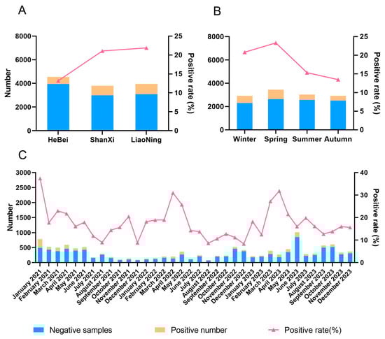 Positivity rate of PRRSV in northern China during 2021–2023. Note: (A): positivity rates of PRRSV in different regions; (B): positivity rates of PRRSV in different seasons; (C): positivity rates of PRRSV in each month during 2021–2023.