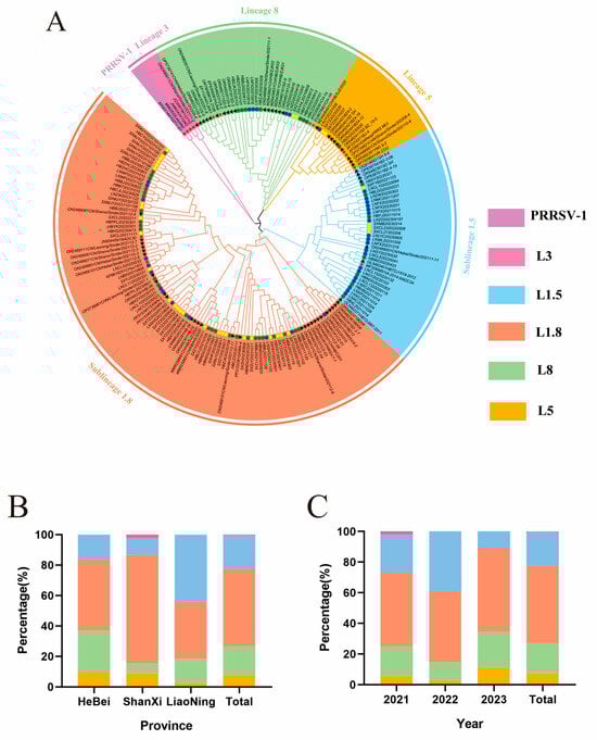 Wu [] examined 1439 PRRSV-2 ORF5 sequences in GenBank (including 34 PRRSV ORF5 determined by the author) collected between 2010 and 2021 from all over China, revealing a progressive increase in the proportion of L1, which exceeded L8 in 2016 and reached 92.75% (64/69) by 2021, identifying it as the predominant epidemiological strain. In this study, 114 ORF5 gene sequences were obtained, 60 ORF5 gene sequences were downloaded from three provinces for genetic evolutionary analysis, and 174 PRRSVs were found to be PRRSV-2. The proportions of L1.8, L1.5, L8, L5, and L3 were 50.00%, 21.84%, 20.11%, 7.47%, and 0.57%, respectively. This suggested that the main PRRSV epidemic strain in northern China was L1.8, followed by L1.5 and L8. In 2017, the first L1.5 strain in China was found in Liaoning and then rapidly developed in North China, East China, Central China, South China, and Southwest China. Xu et al. [] collected 433 positive clinical samples from all over the country between 2020 and October 2021, and comprehensively evaluated the phylogenetic, epidemic, and recombination characteristics of NADC34-like PRRSV in China. The results indicated that the prevalence of L1.5 increased from 3% between 2017 and 2019 to 28.60% in 2021, identifying it as one of the predominant strains extensively distributed in specific regions of China. In this study, it was identified that the proportion of L1.5 was higher in Liaoning (44.19%), whereas in Hebei and Shanxi, the proportions of L1.5 (16.28% and 11.11%) were lower than that of L1.8 (46.51% and 71.11%). During 2021 and 2023, L1.8 and L8 had an upward trend, whereas L1.5 demonstrated a declining trend. Therefore, it is necessary to continue strengthening the monitoring of PRRSV strains.
