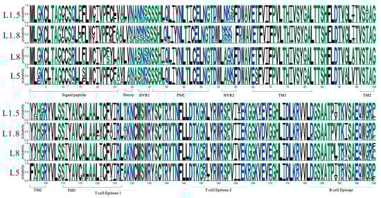 As indicated in Figure 3, the decoy epitopes (A27/V27L28V29N30/S30) of the ORF5 protein associated with immune responses were polymorphic at sites A27/V27, L28, and N30/S30. For L1.5, 2/30 mutations were A27/V27 → S27, while no mutations were found in other lineages. For L1.5 and L8, 6/30 and 1/14 mutations were L28 → P28, respectively; for L1.8, 2/66 mutations were L28 → F28; for L5, 1/4 mutations were N30/S30 → D30; for L1.5, 1/30 mutations were N30/S30 → D30; for L1.8, 2/66 mutations were N30/S30 → G30. In the neutralized antigenic epitopes (S37H38F39/L39Q40L41I42Y43N44) of the ORF5 protein associated with immune responses, several strains were mutated at L39 and L41. L8 had 13/14 mutations of L39 → I39 and 1/14 mutations of L39 → V39; and L1.8 had only 1/30 mutations of L39 → S39. L8 and L1.5 had 2/14 and 16/30 mutations of L41 → S41, respectively.