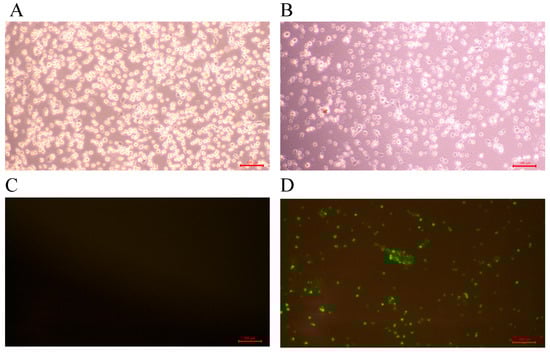 CPE and IFA in PAMs infected with PRRSV isolates (100×). (A): negative control cells (white light); (B): pathological cells (white light); (C): negative control cells (fluorescence); (D): pathological cells (fluorescence).