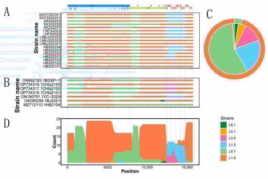 The whole-genome sequences of 17 PRRSV strains from different farms in different regions were obtained through isolation and sequencing. The complete genomes of 10 PRRSV-2 strains (length > 15 kb) obtained from the Hebei, Shanxi, and Liaoning Provinces from 2021 to 2023 were downloaded from NCBI. Six representative strains, namely, NADC34 (L1.5), NADC30 (L1.8), QYYZ (L3.5), VR2332 (L5.1), CH-1a (L8.1), and JXA1 (L8.7), were selected as reference parents. Recombination events were preliminarily detected using SimPlot V3.5 software, with a window size of 200 bp and a step size of 20 bp, and the recombination parent strain and breakpoint location were determined. Then, seven recombination algorithms in Recombination Detection Program v.4.24 (RDP 4.24), including the RDP, GENECONV, Maxchi, Chimaera, 3Seq, Bootscan, and SiSscan programs, were used to detect and analyze possible recombination events. Only when the recombination event was detected by at least four of the seven programs and the p-value was ≤0.01 was it considered that recombination may have occurred.