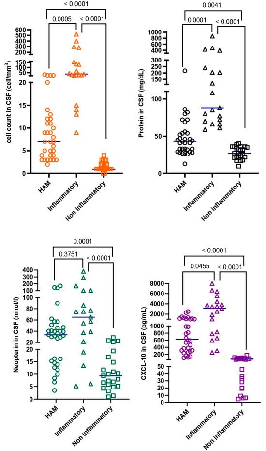 CSF characteristic differences among the three groups (HAM, Inflammatory, and Non-Inflammatory groups). CSF characteristics were compared using Kruskal–Wallis ANOVA, followed by Dunn’s multiple comparison test.
