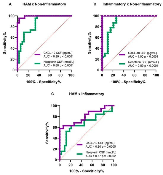 Receiver operating characteristic (ROC) curve analysis was used to calculate the AUC (area under the curve) and the best cut-off values for neopterin and CXCL-10 for determining the points of optimal sensitivity and specificity among the three groups (HAM, and inflammatory compared to non-inflammatory). Statistical analyses were performed using GraphPad Prism version 8 (GraphPad Software, La Jolla, CA, USA). Statistical significance was set at p ≤ 0.05.