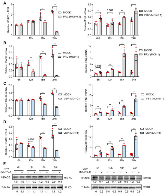 PRV and VSV infection reduces HDAC6 expression in PK15 cells. PK15 cells were infected with PRV (A,B) or VSV (C,D) at moi = 0.1 (A,C) or moi = 1 (B,D) for 1 h and then refreshed with DMEM for culture. The mRNA expression of HDAC6 and IFNβ was quantified from infected PK15 cells harvested at the indicated time points after infection. Relative expression is normalized to that of mock-infected cells at 6 h. Error bars indicate SD (n = 4). Differences between mock and viral-infection groups were statistically analyzed. Note that (B,D) share the same mock infection group because they were tested in the same experiment. HDAC6 protein levels at different time points in PK15 infected with PRV or VSV at moi = 0.1 were determined by western blot (E). Bands were quantified using ImageJ and normalized to the non-infected group at 6 h. * p < 0.05, ** p < 0.01, and the insignificant p-values close to 0.05 were also marked (two-tailed unpaired Student’s t-test for (A–D)).