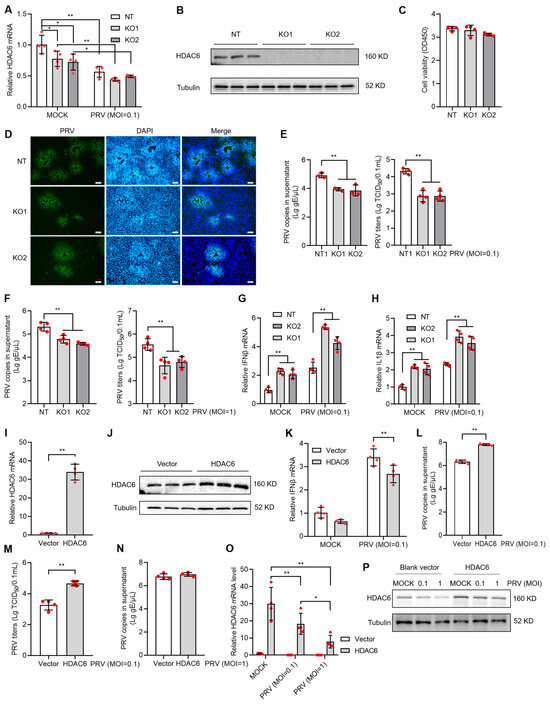 HDAC6 positively regulates PRV infection in PK15 cells. HDAC6 KO cells were screened by CRISPR/Cas9 strategy and the selected single cell colonies were identified by qPCR and WB analyzing HDAC6 mRNA (A) and protein (B) levels, respectively. Cell viability of KO cells was determined by the CCK8 assay after seeding for 24 h at the same density as NT cells (C). The KO and NT control cells were infected with PRV at moi = 0.1. After 24 h, PRV infectivity was assessed by IF assay to label PRV antigen (D) in the infected cells. Scale bars = 100 μm. Viral DNA copies and TCID50 titers were determined in the culture supernatant between KO and NT cells infected with PRV at moi = 0.1 (E) and 1 (F). Mock and PRV-infected NT and KO cells were harvested for total RNA extraction and subjected to qPCR to quantify the mRNA expression levels of IFNβ (G) and IL1β (H). PK15 cells were transfected with HDAC6-expressing plasmid and blank vector as control. The overexpressed HDAC6 mRNA and protein levels were determined by qPCR (I) and western blot (J) in the transfecting cells (J). After infection with PRV at moi = 0.1 for 24 h, IFNβ mRNA expression in the cells (K) and PRV DNA copies in the supernatant (L) were determined by qPCR. PRV titers in supernatant were determined by TCID50 (M). PRV DNA copies in the culture supernatant were determined after infection with PRV at moi = 1 for 24 h (N). HDAC6 expression was determined by qPCR (O) and WB (P) in HDAC6-overexpressing cells with mock and PRV infection at different MOI. Error bars indicate SD. * p < 0.05, ** p < 0.01 (two-tailed unpaired Student’s t-test for (I,L–N); one-way ANOVA with Holm-Sidak’s multiple comparisons test for (C,E,F); and two-way ANOVA with Holm-Sidak’s multiple comparisons test for (A,G,H,K,O)).