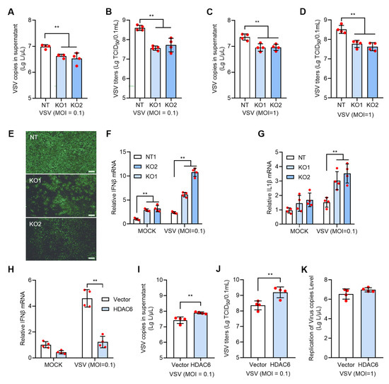HDAC6 positively regulates VSV infection in PK15 cells. The KO and NT PK15 cells were infected with VSV-EGFP at moi = 0.1 (A,B) or 1 (C,D) for 24 h. VSV RNA copies (A,C) and TCID50 titers (B,D) were determined in the culture supernatant between KO and NT cells. The representative images of fluorescent cells with VSV-EGFP infection at moi = 0.1 were shown (E). Scale bars = 100 μm. The mock and VSV-infected NT and KO cells were harvested for total RNA extraction and subjected to qPCR to quantify the mRNA expression levels of IFNβ (F) and IL1β (G). The PK15 cells were transfected with HDAC6-expressing plasmid with blank vector as control and infected with VSV at moi = 0.1 for 24 h to analyze the IFNβ expression (H) and VSV growth level (I,J). VSV RNA copies in the culture supernatant were determined after infection at moi = 1 for 24 h (K). Error bars indicate SD. ** p < 0.01 (two-tailed unpaired Student’s t-test for (I–K); one-way ANOVA with Holm-Sidak’s multiple comparisons test for (A–D); two-way ANOVA with Holm-Sidak’s multiple comparisons test for (F–H)).