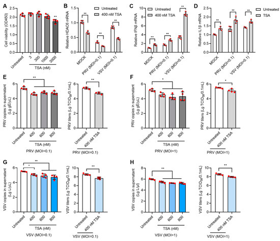 Since HDAC6 expression level is directly related with the infectivity of both DNA and RNA virus, treatment with small molecular drugs regulating HDAC expression level could be exploited as the simple strategy to control virus infection. Many HDAC inhibitors (HDACi) have been developed for various therapeutic purposes. We first chose Trichostatin A (TSA), a broad-spectrum HDACi, to test its effect on viral infection in PK15 cells. Cell viability assay showed that TSA lower than 1000 nM in concentration showed no significant toxicity to PK15 cells (Figure 4A). We treated PK15 cells with 400 nM TSA for 12 h, and then infected the cells with PRV at moi = 0.1 for 24 h. Analysis of gene expression showed that 400 nM TSA can greatly reduce HDAC6 mRNA levels and PRV infection further reduced HDAC6 levels (Figure 4B). In contrast, the IFNβ and IL1β mRNA levels were greatly increased upon 400 nM TSA treatment (Figure 4C,D), which is in agreement with the HDAC6 KO effect observed above. As expected, treatment with TSA in the range of 400–800 nM significantly inhibited PRV replication, as evidenced by decreased viral copies and titers in TSA-treated PK15 cells infected with PRV at moi = 0.1 and 1 (Figure 4E,F). TSA treatment also exhibited a similar inhibitory effect on VSV infection in PK15 cells. TSA treatment decreased the HDAC6 mRNA level and increased IFNβ and IL1β mRNA levels, limiting VSV infection in PK15 cells (Figure 4B–D,G,H).