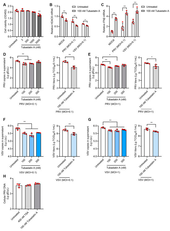Given the non-specific inhibitory effect of TSA on multiple HDACs, we next used the HDAC6 selective inhibitor, tubastatin A, to test its antiviral effect. Tubastatin A showed no cytotoxicity to PK15 cells at doses below 1000 nM (Figure 5A). When PK15 cells were treated with 100 nM tubastatin A for 12 h and then infected with PRV or VSV at moi = 0.1, significantly decreased HDAC6 mRNA and increased IFNβ mRNA were found in tubastatin A-treated cells compared to untreated cells (Figure 5B,C). Tubastatin A at doses of 100 and 200 nM inhibited infection of both PRV (Figure 5D,E) and VSV (Figure 5F,G) at the moi of 0.1 or 1.