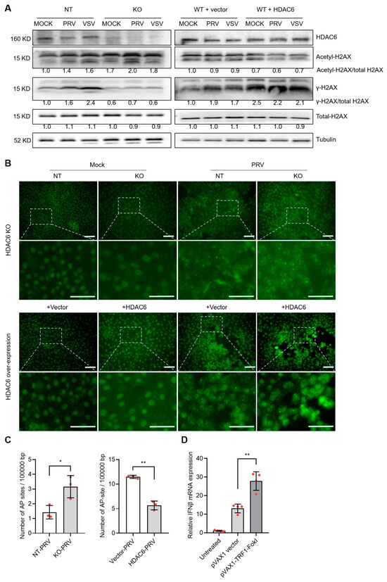 The underlying cause of HDAC6-mediated type I IFN alteration is worthy of further investigation. Many previous reports have highlighted the role of HDAC6 in linking DNA damage response and viral infection [18,19,20,21]. We used WB to detect γ-H2AX (phosphorylated H2AX at Ser 139), an early and sensitive marker monitoring DNA damage [22]. In non-targeting PK15 cells, PRV and VSV infection increased γ-H2AX levels to 1.6 and 2.4 times, respectively, suggesting that viral infection induces more DNA damage, in agreement with the previous publications [21,23]. When cells were depleted of HDAC6, γ-H2AX levels were reduced by approximately 56% and 75% for PRV and VSV infection, respectively. When HDAC6 was overexpressed, γ-H2AX levels were increased by approximately 16% and 24% for PRV and VSV infection, respectively. Meanwhile, we observed the opposite change in the level of acetyl-H2AX. PRV and VSV infection in HDAC6-KO cells increased acetyl-H2AX by approximately 43% and 13%, respectively, whereas PRV and VSV infection in HDAC6-overexpressing cells decreased acetyl-H2AX by approximately 33% and 22%, respectively, compared to infection in NT cells. The results reflect the deacetylating effect of HDAC6 on H2AX (Figure 6A). The balance between phosphorylation and acetylation modifications of H2AX suggests that HDAC6 deacetylates H2AX to promote its phosphorylation.
