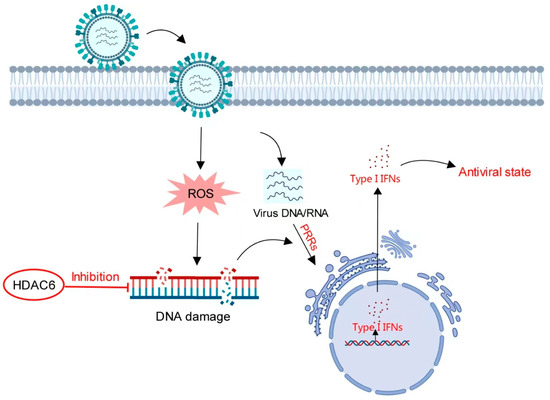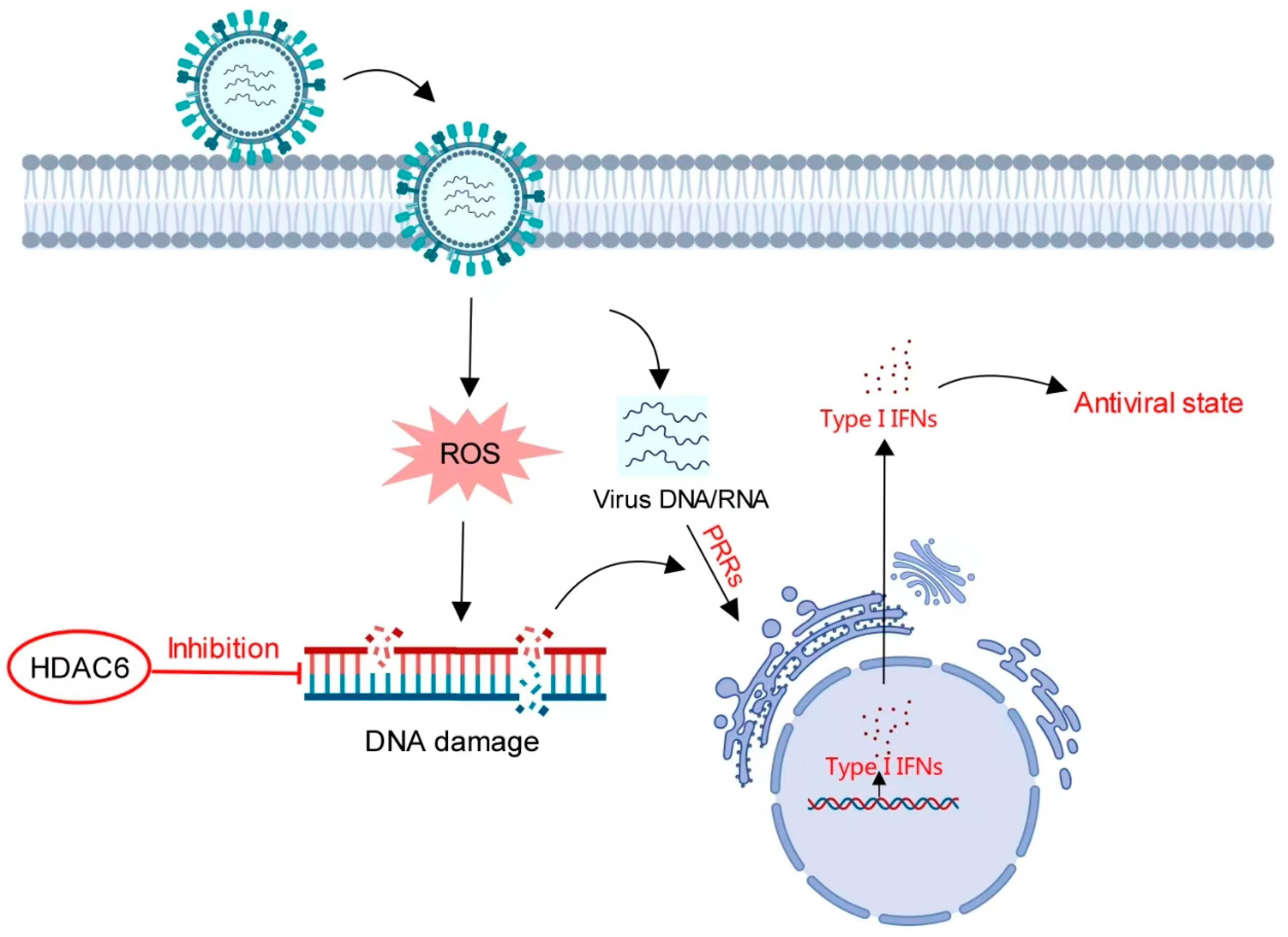 Model for HDAC6-mediated regulation of type I IFN. Viral infection induces increased DNA damage to stimulate type I IFN production in a pathway distinct from the IFN signaling pathway mediated by viral nucleic acid-sensing PRRs. HDAC6 inhibits DNA damage. In the presence of HDAC6, attenuated DNA damage reduces type I IFN production. In the absence of HDAC6, accumulating DNA damage induces more type I IFN production to create an antiviral state in host cells.