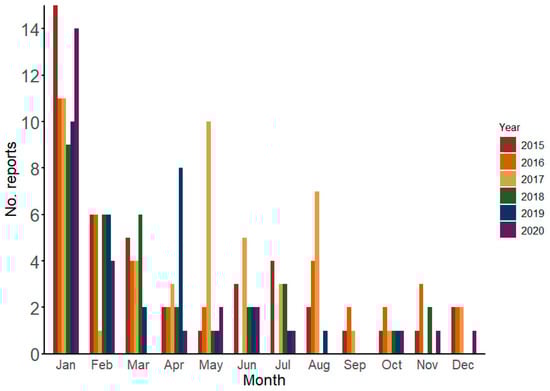The annual average number of new reports was 35 (standard deviation = 7.8), ranging from 27 (2020) to 48 (2017). Most reports (76.8%) were published in the first semester of the year, particularly in January (n = 70), February (n = 29), March (n = 21), April (n = 18), and May (n = 17) (Figure 1).