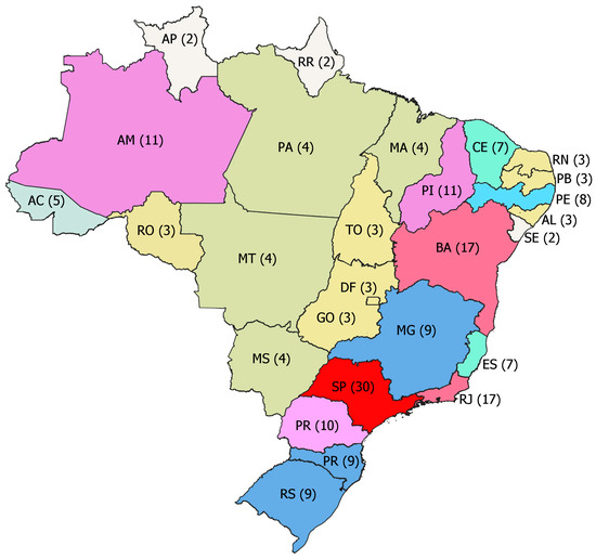 The geographical distribution of the reported sites was mainly São Paulo (n = 43), Rio de Janeiro (n = 18), Bahia (n = 17), Amazonas (n = 11), Piauí (n = 11), Minas Gerais (n = 10), Paraná (n = 10), Rio Grande do Sul (n = 9), Santa Catarina (n = 9), Pernambuco (n = 8), Espírito Santo (n = 6), Ceará (n = 6), and Acre (n = 5) (Figure 2).