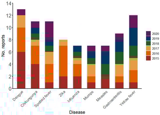 Seventy-eight types of events were reported in humans. The most common events were dengue and Chikungunya in 2015 and 2016; spotted fever in 2016 and 2020; gastroenteritis in 2017, 2018, and 2019; influenza in 2015 and 2016; Zika in 2016; yellow fever in 2019; mumps in 2017; and measles in 2015 and 2019 (Figure 3).