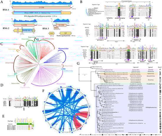 Genome organization, sequence conservation, phylogenetic relationships, and evolutionary insights into Lobesia botrana phasmavirus (LbPV) and related viruses. (A) Schematic representation of the genome organization of LbPV, showing its three-segmented RNA genome. RNA 1 encodes the RNA-dependent RNA polymerase (RdRP), RNA 2 encodes the glycoprotein (G), and RNA 3 encodes the nucleocapsid protein (N). The annotations highlight functional domains, conserved motifs, and transmembrane regions (TM). Coding sequences are depicted in orange arrowed rectangles, predicted proteins in yellow rectangles, and conserved domains in blue rectangles. The coverage plot (blue) displays the read depth across the genome, and the number represents the maximum coverage. (B) Sequence conservation and alignment of the RdRP of LbPV and other bunyavirids. Sequence logos indicate conserved residues across related viruses. Functional motifs (e.g., Motifs A, B, C, D, E) are labeled, and structural elements (e.g., α-helices and β-sheets) are indicated. (C) Circular phylogenetic tree showing relationships among members of Phasmaviridae and other viral families within the Bunyavirales order. Clades corresponding to different families are color-coded, and the tree highlights the evolutionary placement of LbPV within Phasmaviridae. (D) Sequence alignment of the glycoprotein cleavage site, showing conservation of the signal peptide and glycosylation motifs among LbPV and Phasmaviridae members. (E) Sequence logo of conserved terminal sequences of the 3′ RNA segments indicating base-pairing complementarity. (F) Circos plot depicting shared spatial protein domain architectures and sequence similarities across viral families within Bunyavirales. Connections are highlighted in blue (low similarity) to red (high similarity). (G) Maximum-likelihood phylogenetic tree of representative Phasmaviridae species, including members of genus Orphophasmavirus and closely related genera. The tree includes FastTree support values and host associations, with icons representing host types. Virus members of ICTV-recognized species are indicated with binomial nomenclature. The scale bar represents the number of amino acid substitutions per site.