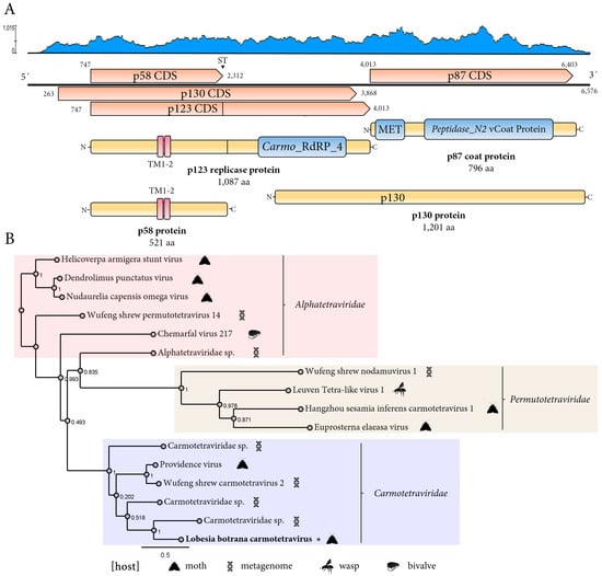 Genome organization and phylogenetic relationships of Lobesia botrana carmotetravirus (LbCaV) and related viruses. (A) Schematic representation of the genome organization of LbCaV. The linear genome is annotated with key coding sequences (CDS), including the replicase proteins (p123), the p130, and the coat protein (p87). Functional domains are highlighted, including Carmo_RdRP_4 (RNA-dependent RNA polymerase), MET (methyltransferase), and Peptidase_N2. Transmembrane regions (TM1-2) are indicated in the p58 protein, while protein sizes in amino acids (aa) are shown for major proteins. The coverage plot (blue) displays the read depth across the genome, with peaks corresponding to coding regions. Coding sequences are depicted in orange arrowed rectangles, predicted proteins in yellow rectangles, and conserved domains in blue rectangles. (B) Maximum-likelihood phylogenetic tree of viruses from Carmotetraviridae, Alphatetraviridae, and Permutotetraviridae. Clades corresponding to each family are shaded (Carmotetraviridae in blue, Alphatetraviridae in pink, and Permutotetraviridae in beige). Host associations are indicated with icons. FastTree support values are shown at nodes, and representative species are labeled. The scale bar represents the number of amino acid substitutions per site. This tree highlights the evolutionary relationships and host diversity among these virus families.