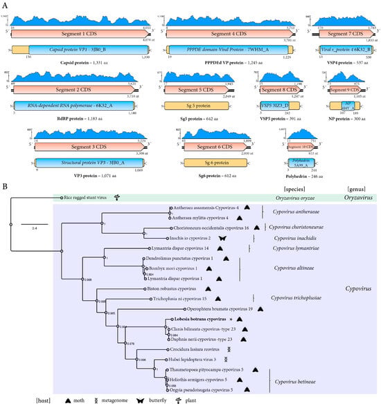 Genomic organization and phylogenetic analysis of Lobesia botrana cypovirus (LbCPV). (A) Genomic organization of LbCPV. The genome is segmented into 10 double-stranded RNA (dsRNA) segments (Seg 1–10). Each segment contains a single open reading frame (ORF) encoding a single protein. The predicted functions of the encoded proteins are indicated. The coverage plot (blue) displays the read depth across the genome. Coding sequences are depicted in orange arrowed rectangles, predicted proteins in yellow rectangles, and conserved domains in blue rectangles. (B) Phylogenetic tree of LbCPV and cypoviruses based on the amino acid sequences of the replicase protein. The tree used is an outgroup of the orizavirus Rice ragged stunt virus. FastTree support values are shown at nodes, and representative species are labeled. The scale bar represents the number of amino acid substitutions per site. The hosts of the viruses are indicated by icons.