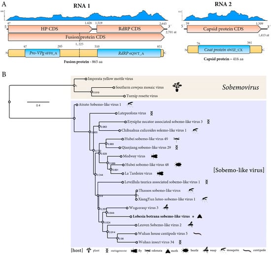 Genomic organization and phylogenetic analysis of Lobesia botrana sobemo-like virus (LbSV). (A) Genomic organization of LbSV. The genome is segmented into two positive single-strand RNA (+ssRNA) segments (RNA 1 and RNA 2). The predicted functions of the encoded proteins are indicated. The coverage plot (blue) displays the read depth across the genome. Coding sequences are depicted in orange arrowed rectangles, predicted proteins in yellow rectangles, and conserved domains in blue rectangles. (B) Phylogenetic tree of LbSV, sobemovirus, and sobemo-like viruses based on the amino acid sequences of the replicase protein. FastTree support values are shown at nodes, and representative species are labeled. The scale bar represents the number of amino acid substitutions per site. The hosts of the viruses are indicated by icons.