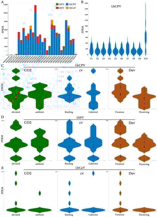Figure 5C–E presents the RNA levels of LbCPV, LbSV, and LbCaV under varying environmental conditions, grapevine cultivars, and developmental stages of V. vinifera. Under elevated CO2 conditions, LbCPV exhibited slightly higher FPKM values compared to ambient CO2, suggesting that elevated CO2 may enhance viral RNA expression (Figure 5C). In contrast, LbSV (Figure 5D) and LbCaV (Figure 5E) showed no significant differences in expression levels between the two CO2 conditions, suggesting the possibility that these viruses may be less responsive to atmospheric CO2 variations. Viral RNA levels were also compared between two grapevine cultivars: Cabernet Sauvignon and Riesling. For LbCPV, FPKM values were slightly higher in Riesling than in Cabernet Sauvignon, suggesting a potential host effect for this virus. Similarly, LbSV displayed marginally higher expression in Riesling, while LbCaV exhibited negligible differences between the two cultivars. The RNA expression of LbCPV varied between flowering and veraison stages, with higher levels observed during veraison (Figure 5C). A similar trend was noted for LbSV (Figure 5D). For LbCaV (Figure 5E), RNA levels were lower overall, with only a minor increase during veraison, suggesting either mild or no effect of the cv. host on RNA virus titters. Nevertheless, caution should be exercised when interpreting these RNA virus expression levels due to the relatively low sample size, which may limit the generalizability of the findings. Additionally, other unassessed variables, such as environmental stressors, microbial interactions, or host physiological conditions, may influence viral RNA levels and confound the observed patterns. Further investigations are warranted to elucidate the ecological and epidemiological factors driving the observed patterns and to assess the potential implications on the host.