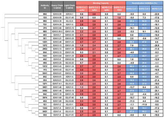 Identification of cross-reactive and cross-neutralizing mAbs against SARS-CoV-1 and SARS-CoV-2. The monoclonal antibodies (mAbs) were isolated from single B cells sorted using SARS-CoV-2 S1 protein as bait. The binding capacity (OD450) to prefusion-stabilized spike ectodomains of SARS-CoV-1, SARS-CoV-2, MERS-CoV and SARS-CoV-2 WT RBD is shown for mAbs in culture supernatants (5-fold dilution) and representative of two independent experiments (values are colored by a gradient of red). Pseudovirus neutralization potency (normalized to virus control = 100%) is shown for mAbs in culture supernatants (9-fold dilution). Data represent the mean from two independent replicates. Antibodies exhibiting >10% inhibition were classified as neutralizing (colored blue). Phylogenetic analysis of mAbs based on heavy chain amino acid sequences was performed using PhyloSuite.