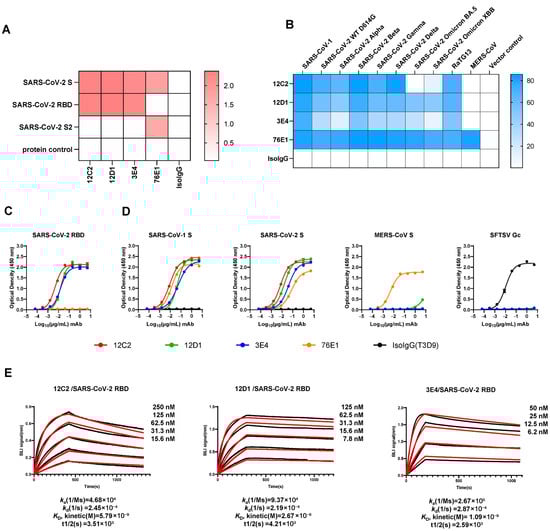 Binding profiles of the top three mAbs. (A) Domain-specific binding (OD450) of mAbs 12C2, 12D1, and 3E4 (1 µg/mL) measured by ELISA. (B) Flow cytometry analysis of the three RBD-targeting mAbs (1 µg/mL) binding to spike-expressing 293T cells. (C,D) Binding curves of the three mAbs to SARS-CoV-2 WT RBD (C) and to prefusion-stabilized spike ectodomain proteins of SARS-CoV-1, SARS-CoV-2, and MERS-CoV (D). The S2-targeting mAb 76E1 served as a positive control, while SFTSV Gc protein and Gc-specific mAb T3D9 (Isotype IgG, IsoIgG) were included as negative controls. Data are presented as mean ± SEM (standard error of the mean) from technical duplicates, representative of three independent experiments. (E) Binding affinities of mAbs to SARS-CoV-2 WT RBD measured by biolayer interferometry (BLI). Representative sensorgrams from three independent experiments are shown, with average kinetic values (ka, kd, KD and t1/2) indicated below. The raw data are shown as black lines and the fitting curves are shown as red lines.