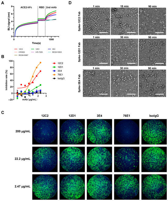 Mechanisms of neutralization by mAbs 12C2, 12D1, and 3E4. (A) Inhibition of hACE2 binding to recombinant SARS-CoV-2 WT RBD by mAbs, assessed via competitive BLI. hACE2-Fc was immobilized on Protein A biosensors to capture RBD, followed by measurement of mAb binding to the captured RBD. CR3022, W328-6E10, VIR-7229, REGN10933, and REGN10987 served as controls. Representative binding curves from two independent experiments are shown. (B,C) Fusion inhibition activity of the three mAbs, measured using a dual split protein (DSP) assay with 293T effector cells (co-expressing SARS-CoV-2 Spike and DSP1-7) and BHK21-hACE2 target cells (expressing DSP8-11). (B) Fusion inhibition curves based on luciferase activity (relative to no-antibody control, set to 100%). Data are presented as mean ± SEM from technical duplicates and are representative of three independent experiments. (C) GFP-based quantification of cell–cell fusion in the presence of the indicated mAbs. Fusion peptide-targeting mAb 76E1 served as a positive control. Representative images from three independent experiments are shown. (D) Negative-stain EM of S-Fab complexes. Purified prefusion-stabilized SARS-CoV-2 S ectodomain trimers were incubated with a 1.2-fold molar excess of 12C2, 12D1, or 3E4 Fab for 1–90 min on ice. Complexes were diluted to 0.02 mg/mL, applied to carbon-coated copper grids, and stained with 2% uranyl acetate. Images were acquired at 57,000× magnification on a Talos L120C TEM (Thermo Fisher Scientific). Scale bar: 100 nm.
