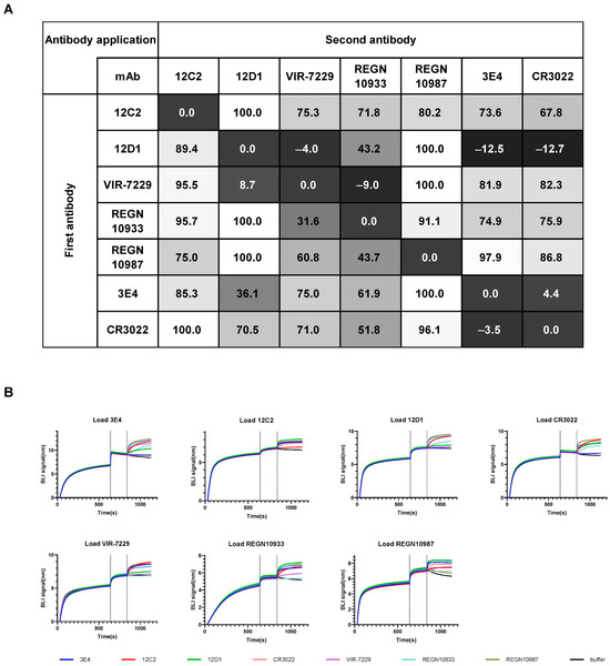 Recognition of two non-overlapping RBD epitopes by mAbs 12C2, 12D1, and 3E4. (A) Epitope competition assays for mAbs binding to SARS-CoV-2 WT RBD were determined by BLI. The table shows the binding signal of test antibodies expressed as a percentage of the signal from a non-competing antibody (with the highest non-competing signal set to 100%). A value < 30% was considered strong competition. Previously reported RBD cross-neutralizing mAbs (CR3022, VIR-7229, REGN10933, and REGN10987) were used as controls. Data represent the mean of two independent replicates. (B) Representative BLI competition binding curves from two independent experiments.