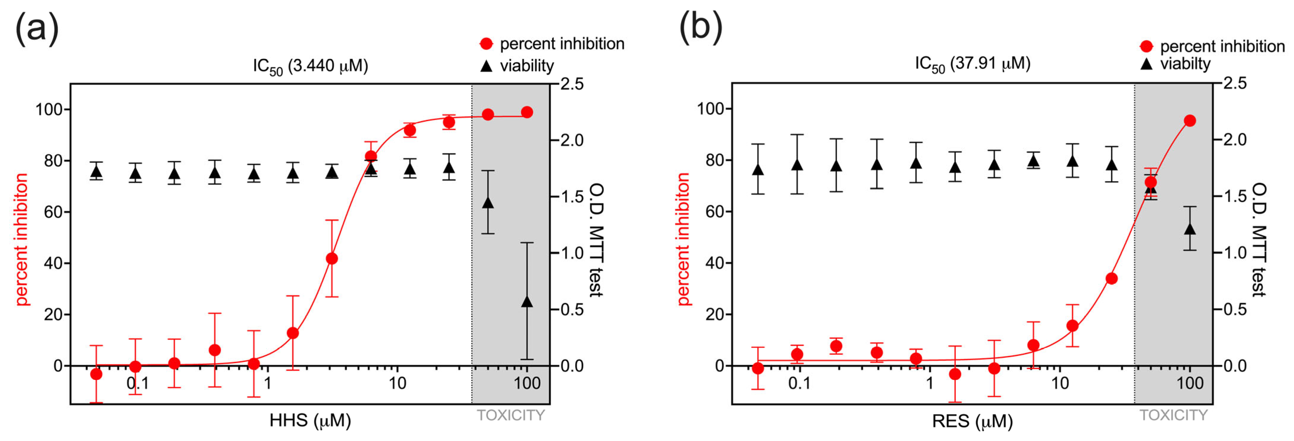 - Docherty, J.J.; Fu, M.M.; Stiffler, B.S.; Limperos, R.J.; Pokabla, C.M.; DeLucia, A.L. Resveratrol inhibition of herpes simplex virus replication. Antivir. Res. 1999, 43, 145–155. [Google Scholar] [CrossRef]