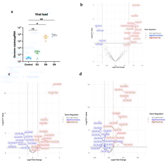 (a) Viral load in the brain was determined using RT-qPCR (n = 3 per time point). Statistical significance was determined with the Kruskal–Wallis test, followed by Dunn’s test; * p < 0.05; ** p < 0.01; ns, non-significant. Volcano plots (b) at day 3 post-infection, (c) at day 6 post-infection, (d) at day 9 post-infection. Significantly differentially expressed miRNAs were determined based on a cutoff p-value of less than 0.05 and absolute Log2 Fold change value greater than 0.75. Red represents significantly upregulated; blue represents significantly downregulated.