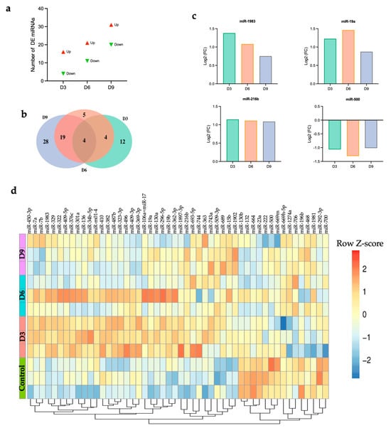 (a) Number of DE miRNAs at each time point, (b) Venn diagram, (c) common differentially expressed miRNAs, (d) heatmap showing hierarchical clustering of the top 50 DEGs at day 3, 6, and 9 post-infection for individual samples. Z-score normalization (row scaling) was applied to standardize the gene expression across samples. Each row represents an individual sample.