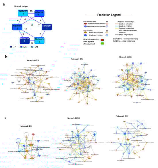 Network analysis of dysregulated miRNAs. (a) Overlapping networks. (b,c) Enriched networks at day 3, 6, and 9 post-infection. Red represents significantly upregulated; blue represents significantly downregulated. The color-coded arrows represent activation (orange), inhibition (blue), and unknown or indirect interactions (gray), with solid lines indicating confirmed interactions and dashed lines indicating predicted or inferred associations.