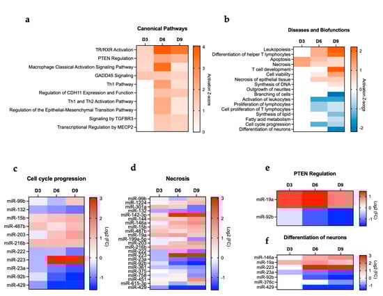IPA. (a) Canonical pathways. (b) Diseases and biofunctions. miRNAs associated with (c) cell cycle progression, (d) necrosis, (e) PTEN regulation, and (f) differentiation of neurons.
