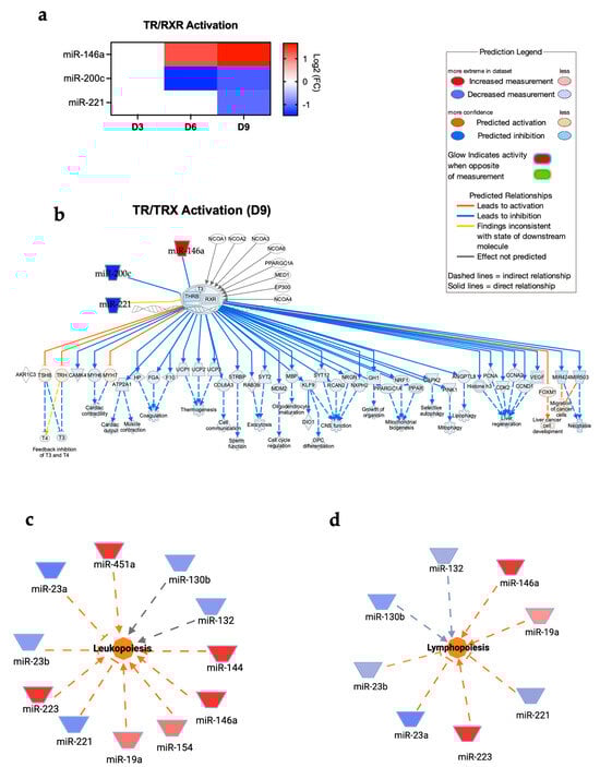 (a) Expression of miRNAs associated with TR/RXR pathways at day 3, 6, and 9 post-infection. (b) TR/RXR pathway at day 9 post-infection. Network diagrams of miRNAs associated with (c) leukopoiesis and (d) lymphopoiesis at day 9 post-infection. Red represents significantly upregulated; blue represents significantly downregulated. The color-coded arrows represent activation (orange), inhibition (blue), and unknown or indirect interactions (gray), with solid lines indicating confirmed interactions and dashed lines indicating predicted or inferred associations.