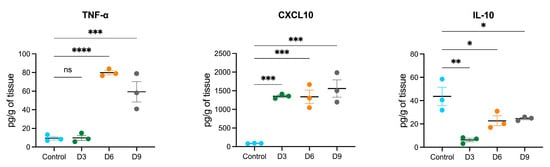 We detected early upregulation of miR-19a that persisted until 9 dpi in POWV-infected brains. It has been shown that treatment of primary microglia cells with miR-19a results in the upregulation of cytokines such as tumor necrosis factor-α (TNF-α) and chemokines such as chemokine C-C motif ligand 2 (CCL2) and C-X-C motif chemokine ligand 10 (CXCL10) []. Another study showed that miR-19a plays a role in the suppression of interleukin-10 (IL-10) in peripheral dendritic cells []. Using a multiplex immunoassay, we measured the protein levels of TNF-α, CXCL10, and IL-10 in POWV-infected brains at 3, 6, and 9 dpi (Figure 6). We detected increased levels of TNF-α and CXCL10 starting at 3 dpi that became prominent by 9 dpi. On the other hand, we detected decreased levels of IL-10 in POWV-infected brains.