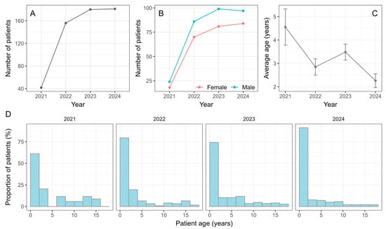 Regarding the average age of patients, it was highest during 2021 at 4.6 years and then decreased by approximately 1.5 years in the following three periods (Figure 1C). An omnibus test showed a significant difference in the age between the four periods (p = 0.0081, Kruskal–Wallis rank sum test), with a significant difference between the 2021 and 2024 periods (p = 0.00043, Mann–Whitney test). The patient age distribution was positively skewed in all periods. The decrease in the average age in 2024 occurred due to a large increase in the proportion of infants (Figure 1D).