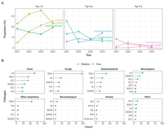The clinical presentation also differed across the observed years, with fever and cough being the most common ones (Figure 2A). Interestingly, while cough was the first or second most prevalent symptom during 2022–2024, practically no patients were admitted with cough symptoms during the first quarter of 2021. Figure 2B shows the most common pathogens associated with each symptom category. As expected, symptoms such as fever and cough are predominantly associated with viral infections, and urinary symptoms with bacterial infections.