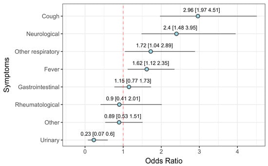 To quantify the likelihood of detecting a viral or bacterial pathogen depending on the symptoms and signs at admission, multivariable logistic regression was used to estimate the odds ratios for each symptom category (Figure 3). The results show that cough, neurological, other respiratory symptoms and fever were positively associated with viral pathogens, while displaying urinary symptoms increased the odds of an underlying bacterial infection. For other symptom categories, there was no statistically significant difference in association with either viral or bacterial pathogens.