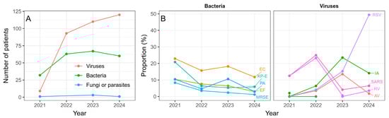 The isolates’ profile changed over the years, with bacterial infections being more prevalent in 2021, and their proportion becoming lower than that of viral infections throughout 2022–2024. The number of infections due to fungi or parasites was negligible and practically constant over the years (Figure 4A, Table 1). The differences in proportions of patients with different pathogen types across the years were statistically significant (p = 2.2 × 10−16, Pearson’s Chi-squared test).