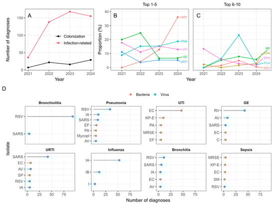 (A) The number of patients with and without an infection-related diagnosis at the time of discharge. (B,C) The trends of proportions of top ten most common diagnosis overall across the four years. (D) The most frequent isolates for eight most common discharge diagnoses. Abbreviations: BRT = bronchiolitis, PNA = pneumonia, UTI = urinary tract infection, GE = enteritis/gastroduodenitis, URTI = upper respiratory tract infection, FLU = influenza, BR = bronchitis, SPS = sepsis, ADV = adenovirus infection, AOM = acute otitis media.
