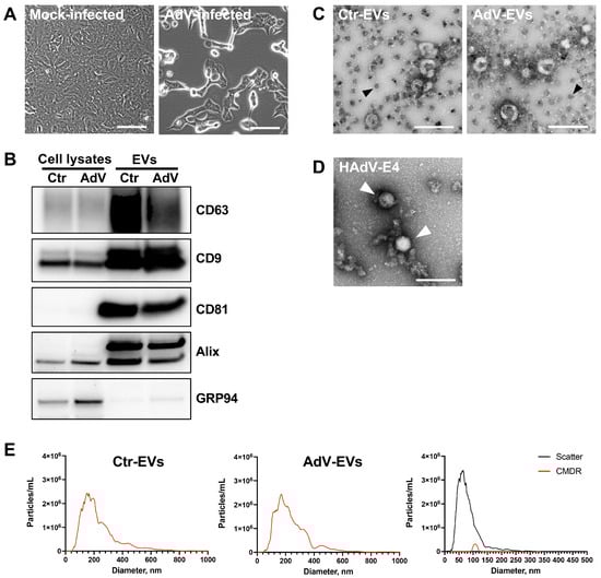 Characterization of the EV populations isolated from the mock- and AdV-infected A549 cells. (A) Phase contrast images of the A549 cells showing the magnitude of cytopathic effect at 24 h post-infection. Cells were infected at MOI = 10. Scale bars = 100 µm. (B) The representative Western blot analysis showing enrichment of the EV markers CD63, CD9, CD81, Alix in EVs-Ctr and EVs-AdV, compared to their cells of origin (cell lysates). The ER marker GRP94 was used to assess the presence of non-EV contaminants. Images are representative of three different experiments. (C) The TEM images of EVs isolated by magnetic immunocapture form the supernatants of mock-infected cells (Ctr-EVs) or HAdV-E4-infected (AdV-EVs) A549 cells. The magnetic beads are recognizable by their opaque appearance and uniform size of 50 nm (black arrows). Scale bars = 200 nm. (D) The TEM image of the purified HAdV-E4 particles (white arrows). Scale bar = 200 nm. (E) The fluorescent nanoparticle tracking analysis of Ctr-EVs (left panel), AdV-EVs (middle panel), and magnetic beads alone (right panel).