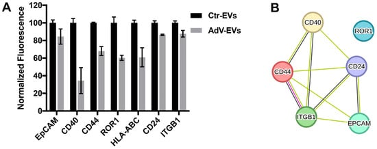 Characterization of the surface markers of AdV-EVs and Ctr-EVs. (A) The MACSPlex flow cytometry detection of surface markers. The data represent ratios of normalized median fluorescent intensity (MFI) in AdV-EVs over Ctr-EVs. The mean values from of two independent experiments ± SEM are shown. (B) The STRING protein–protein interaction network analysis of the proteins shown in (A). The yellow lines represent text mining evidence, the black lines represent co-expression evidence, and the purple line represents experimental evidence.